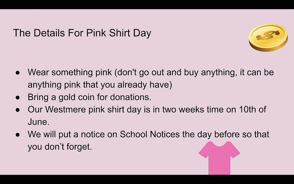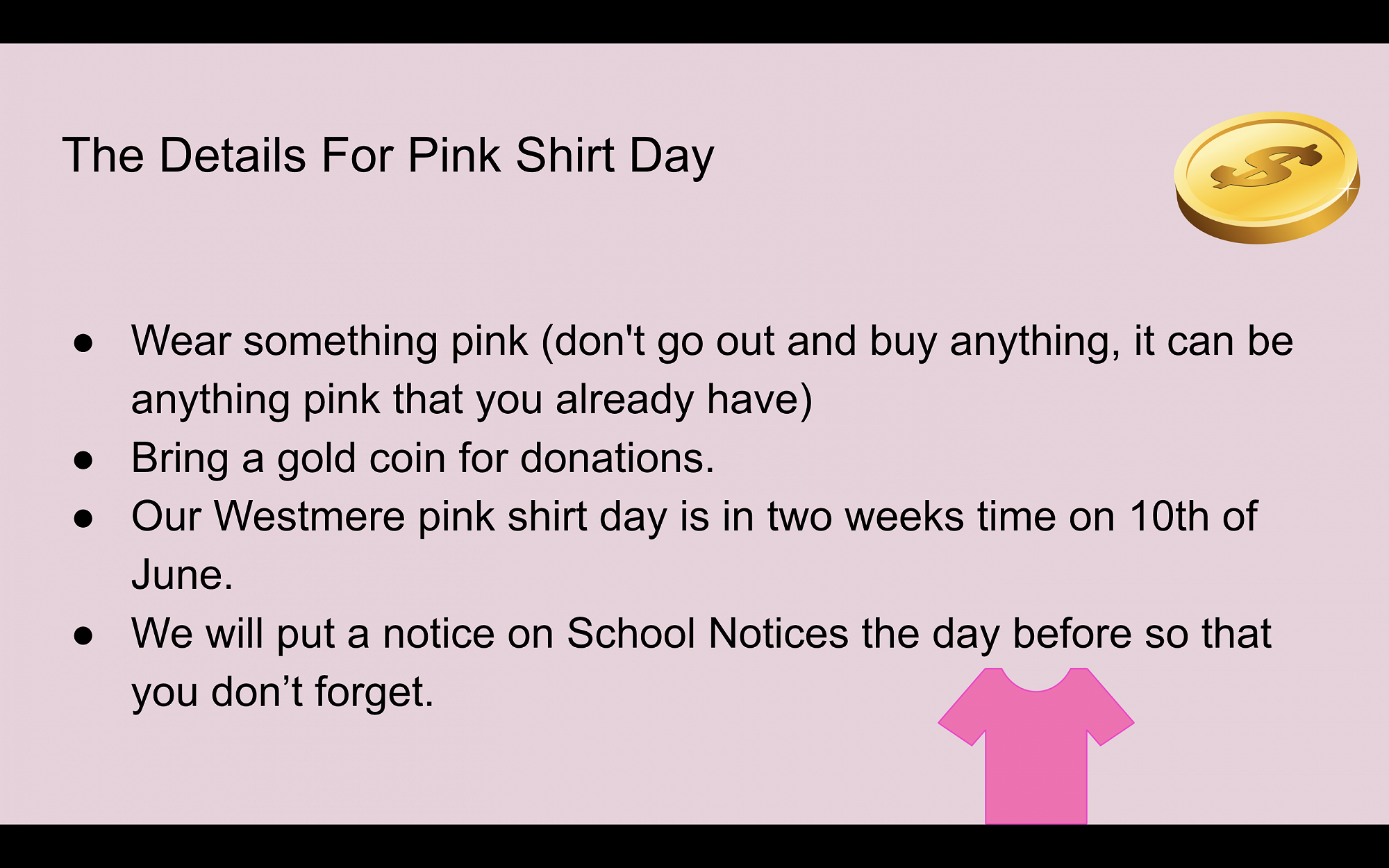 Thanks to Holly, Georgia, Ruby, Harriet and Georgia for their work on organising a Westmere Pink Shirt Day. They will announce this to students in assembly tomorrow.