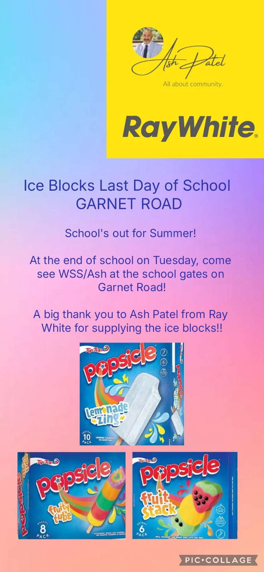 Look out for Ash and the WSS on the Garnet Road gate on the last day of term - they'll be handing out ice blocks. Thanks Ash!