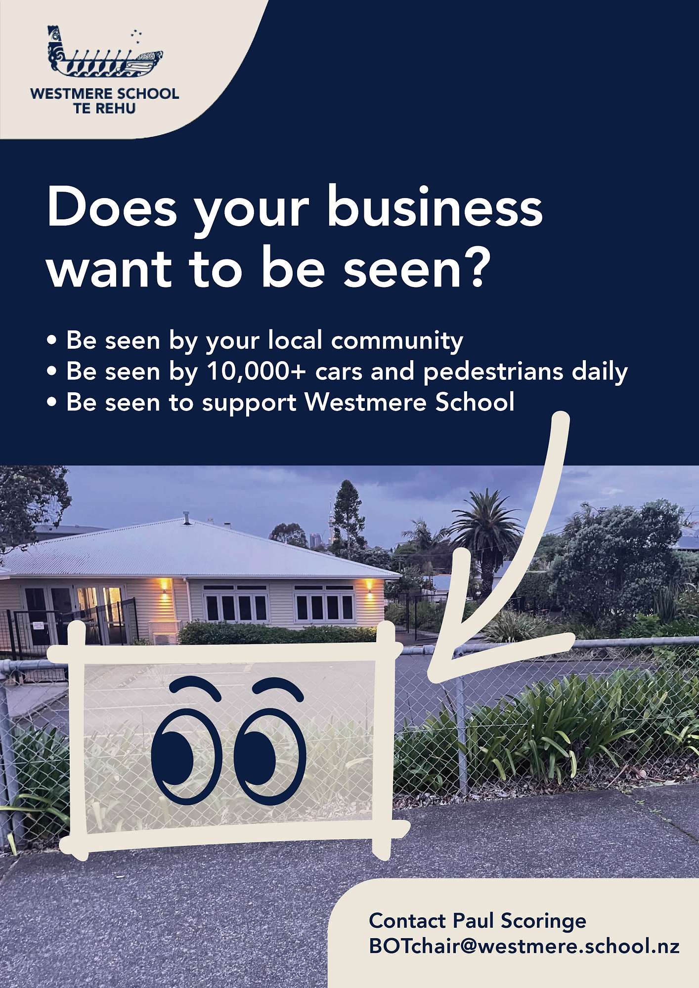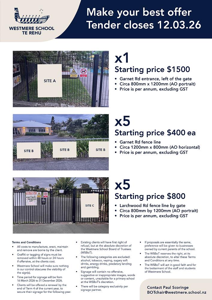 Westmere School | Te Rehu is inviting local businesses and organisations to tender for signage opportunities around the school's perimeter fence line.