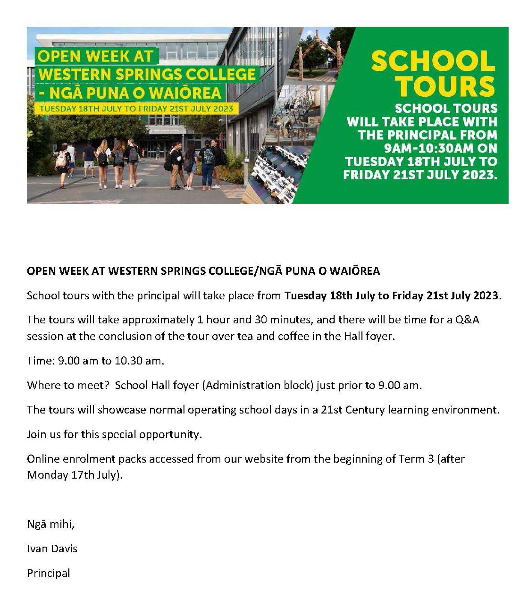 Meet under the supertop and the Powhiri will be held in the hall, followed by coffee/tea in the staffroom.