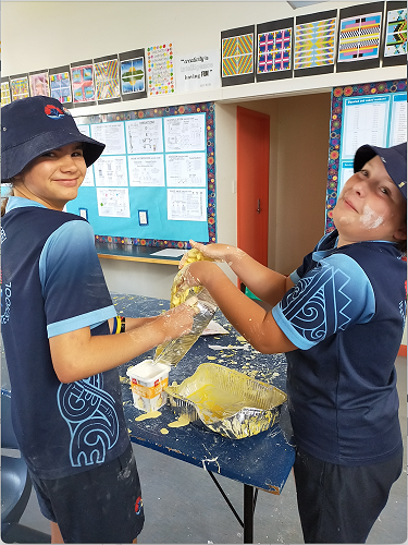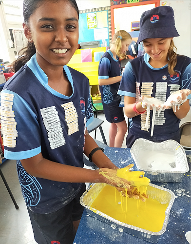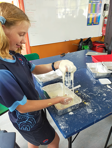 Oobleck is a mixture of cornflour (custard powder works as well) and water named after a substance in a Dr. Seuss book. This liquid is a runny goo until you apply stress to it, and then it suddenly acts like a solid. You can hit a bowlful with a hammer, and instead of splashing everywhere, the particles lock together. You can roll it into a solid ball in your hand, but if you stop moving it, it reverts to liquid and oozes out through your fingers. In scientific terms, it is a non-Newtonian fluid (a fluid that changes its consistency under stress) like tomato sauce which becomes more liquid if you hit or shake the bottle. The reason why cornflour works so well to make oobleck is that it contains starch which does not dissolve in the water but instead is suspended in it. When the force applied, the particles of starch get mashed together, trapping water molecules between them, and the oobleck temporarily turns into a semi-solid material. A real-life example of this occurred during the 2010/2011 Canterbury earthquakes when the force of the quakes turned seemingly solid clay into a runny liquid (liquefaction). Our reason for doing this experiment is fun! Making oobleck is a great reason to make a mess, all in the name of science!
