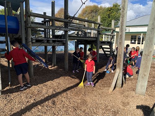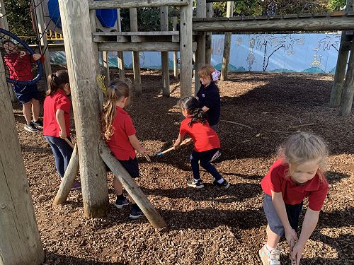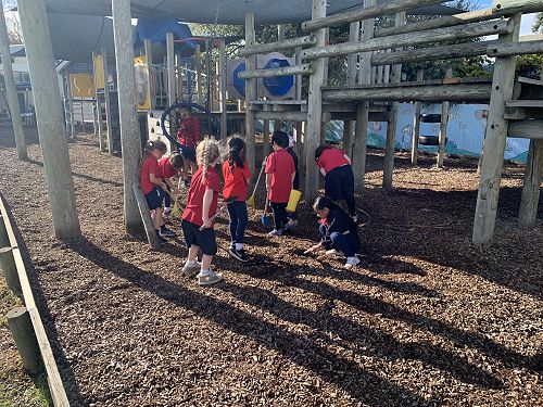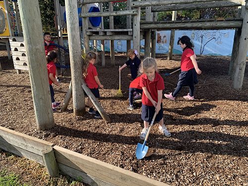 Rata and Akeake have been learning how to do maintenance on our playground. We use rakes, shovels and buckets to make sure the bark is spread evenly, especially under the swing.