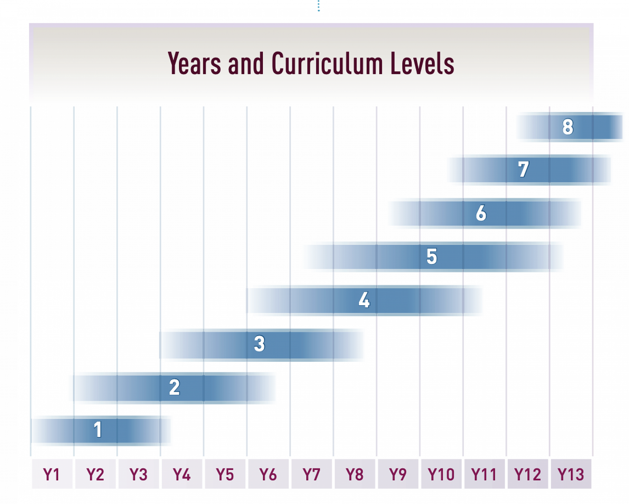 This diagram shows how curriculum levels typically relate to years at school. Within each of the curriculum subject areas, most students will progress through levels 1-5. The level that each child is learning at will vary compared to the other children in the same year and it is important not to compare your child's progress with that of others. Every child learns at a different rate and there are other impacting factors.