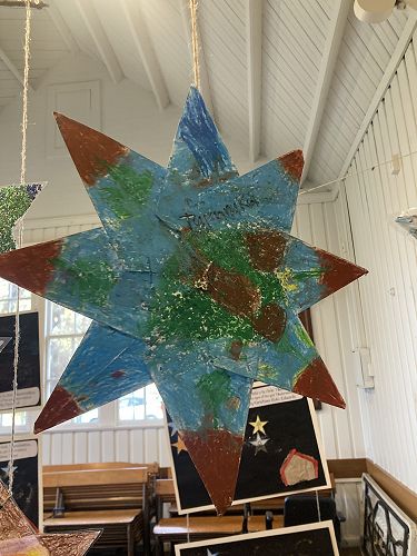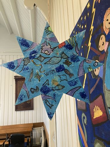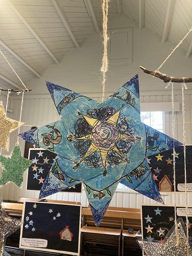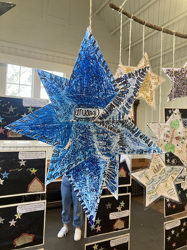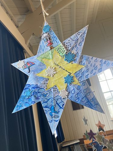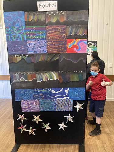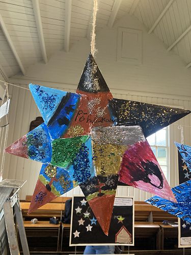 Manuka and Kowhai nui have worked collaboratively to explore their star and produce some art to represent it. The Stars were made using origami by a group of students. They had to Critically Think about what symbols and colours they would use to share the message of each star.