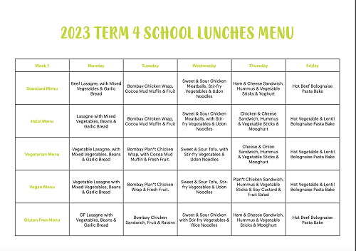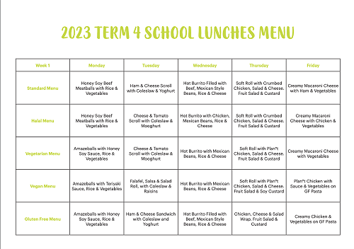 Great news! Our free School Lunches are back in Term 4 with an updated menu! Compass have brought back many of the favourites like the Burritos, Macaroni Cheese and Lasagne along with introducing some new exciting items such as Bombay Chicken Wrap, Sweet & Sour Chicken Meatballs and Ham & Cheese Scroll into the menu which we are sure the children will enjoy!