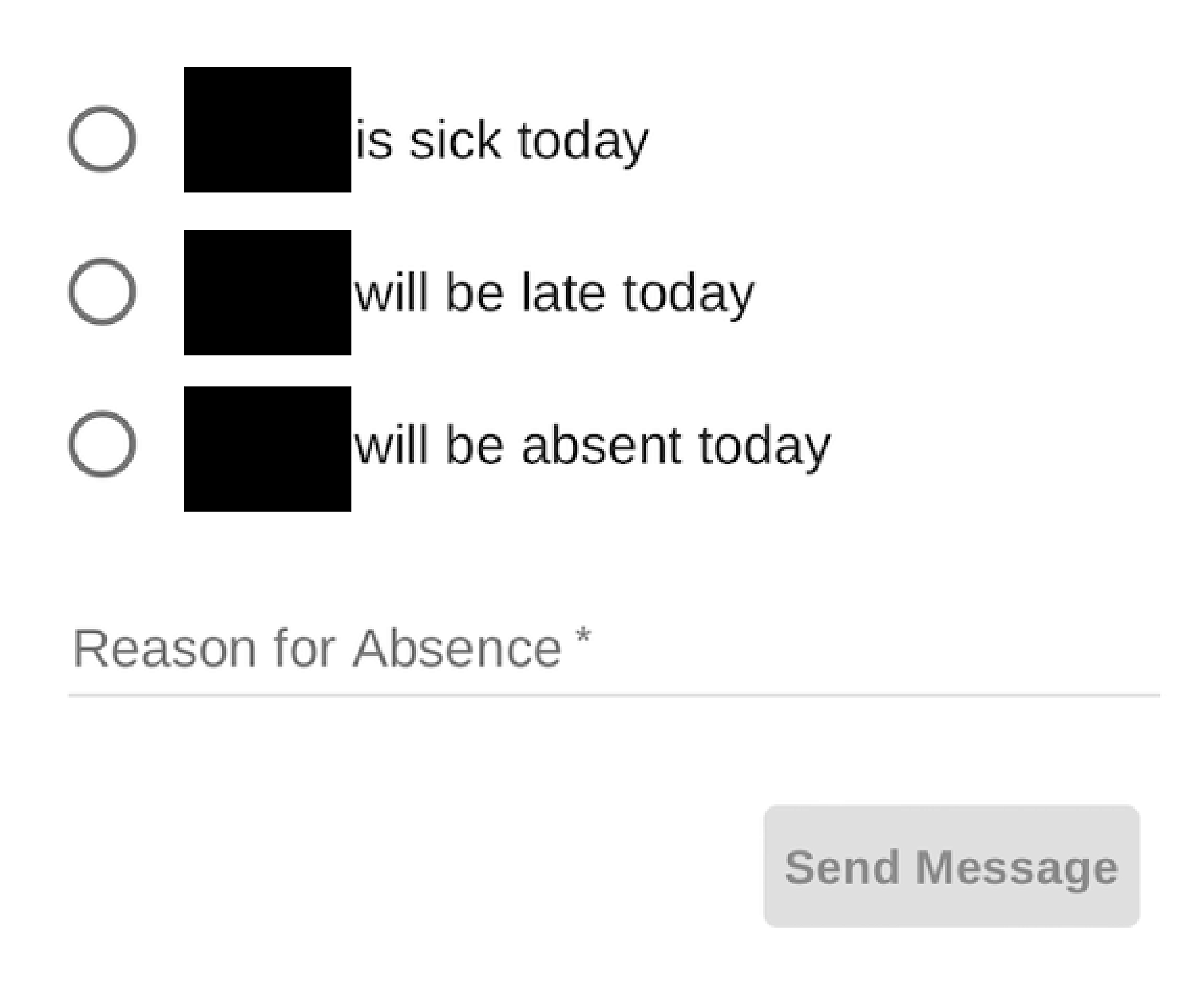 Alternatively please phone 389 8112 and press 1 when prompted and leave a message or TEXT ONLY to 027 758 1467 BEFORE 9AM PLEASE. If leaving a message, please advise name and reason for absence.