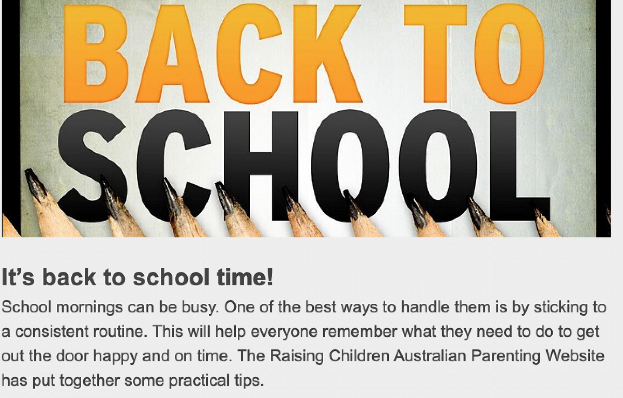 - A consistent morning routine will help everyone get out the door on time and be happy.