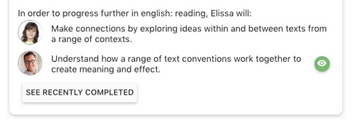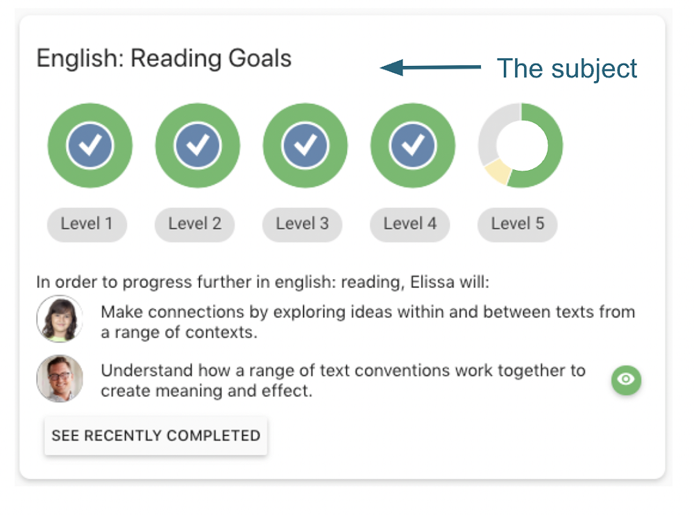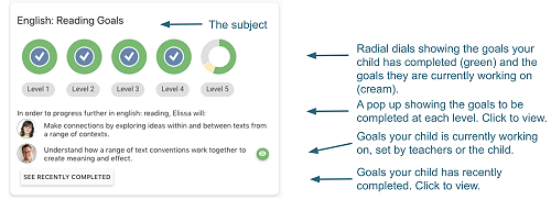 Part 3 and 4: Also, under Reading, Writing and Maths, you will see the current goals that your child is working on as well as you have the opportunity to click on and see the recently completed goals. This provides you with a chance to see what knowledge your child is currently trying to develop and what they have worked on in the past. See the photo below.