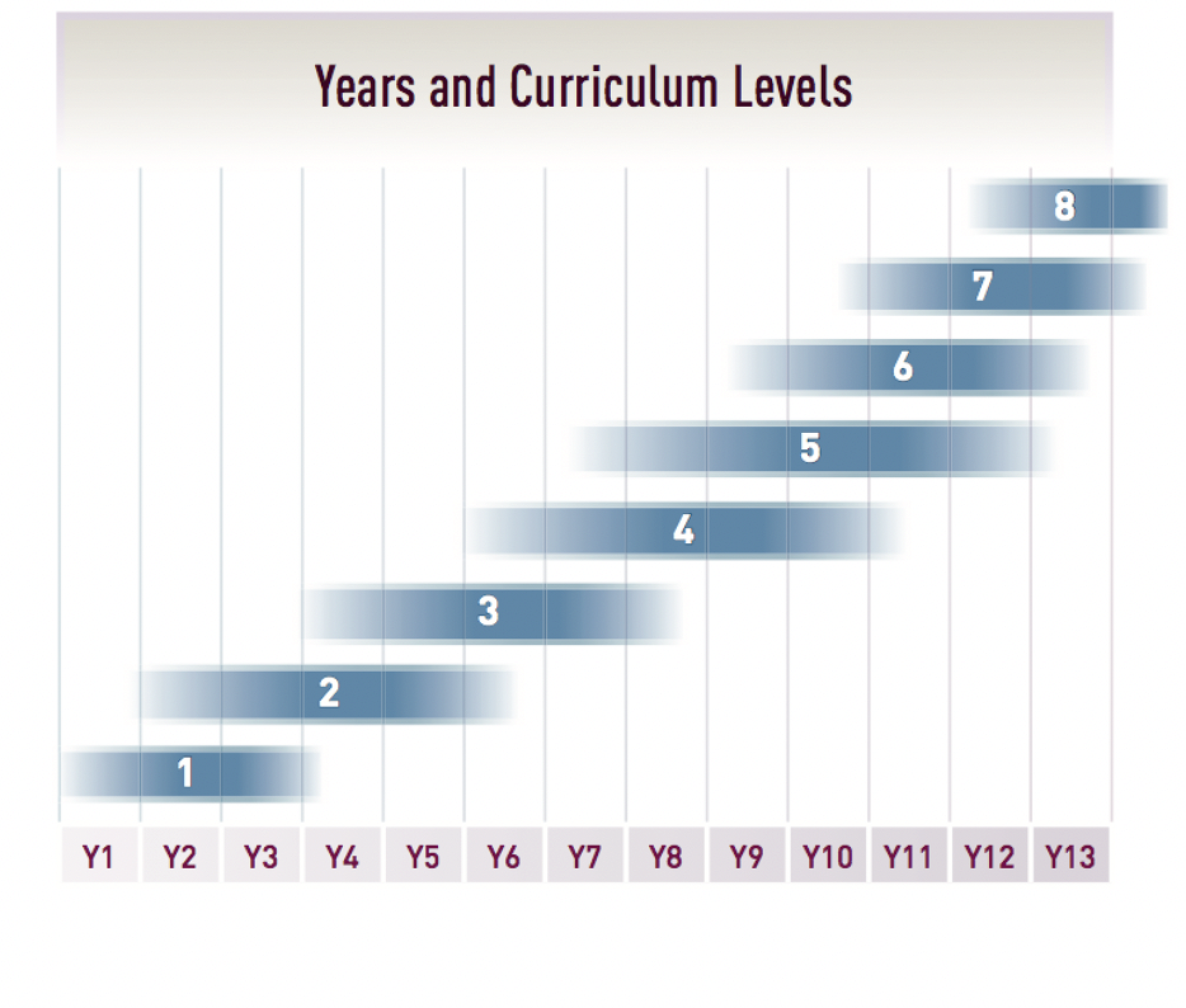 Radial dials (referring to the green and blue circles on the photo below). These refer to how much for each curriculum level has been completed by your child. Please see the second photo (the one that looks like a graph) that comes from the NZ Curriculum which provides you with a guide of how many curriculum levels your child should be achieving per years at school. A general guide in NZ is two years at school per one curriculum level.