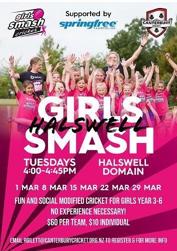 Girls Smash is a social introductory cricket option for Year 3-6 girls. The local hub will be run at Halswell Domain on Monday afternoons, starting 1st March. There is a very low cost of $10 for the whole 5 week programme, and all registered girls get a pink Girls Smash t-shirt to keep. The attached poster has all the necessary information.