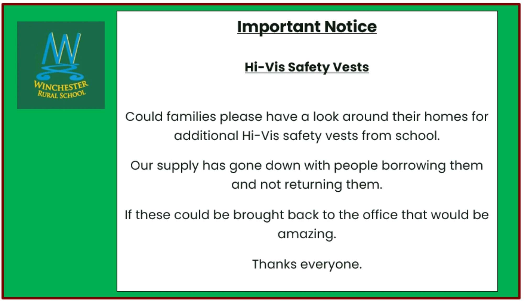 VESTS: Please ensure your child wears a vest to school everyday. If your child has borrowed a vest from the office please return asap.