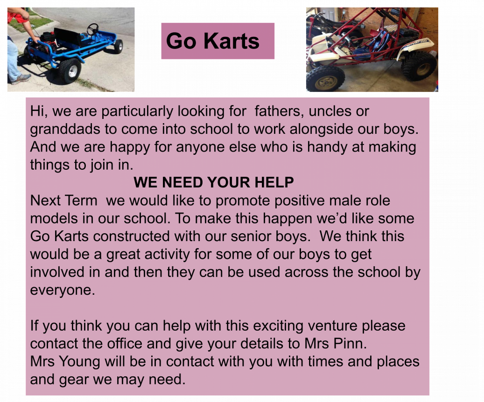 HELP NEEDED: We still need a couple more blokes to help us with our Go Karts.