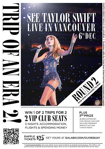We are raffling off TWO all-expenses paid trips for TWO people to see Taylor Swift perform live in Vancouver, Canada. The prize includes return flights, two VIP tickets to the Eras tour, hotel, and spending money. As two trips are up for grabs, each $25 ticket has two chances to win. The prizes are valued at over $60,000.