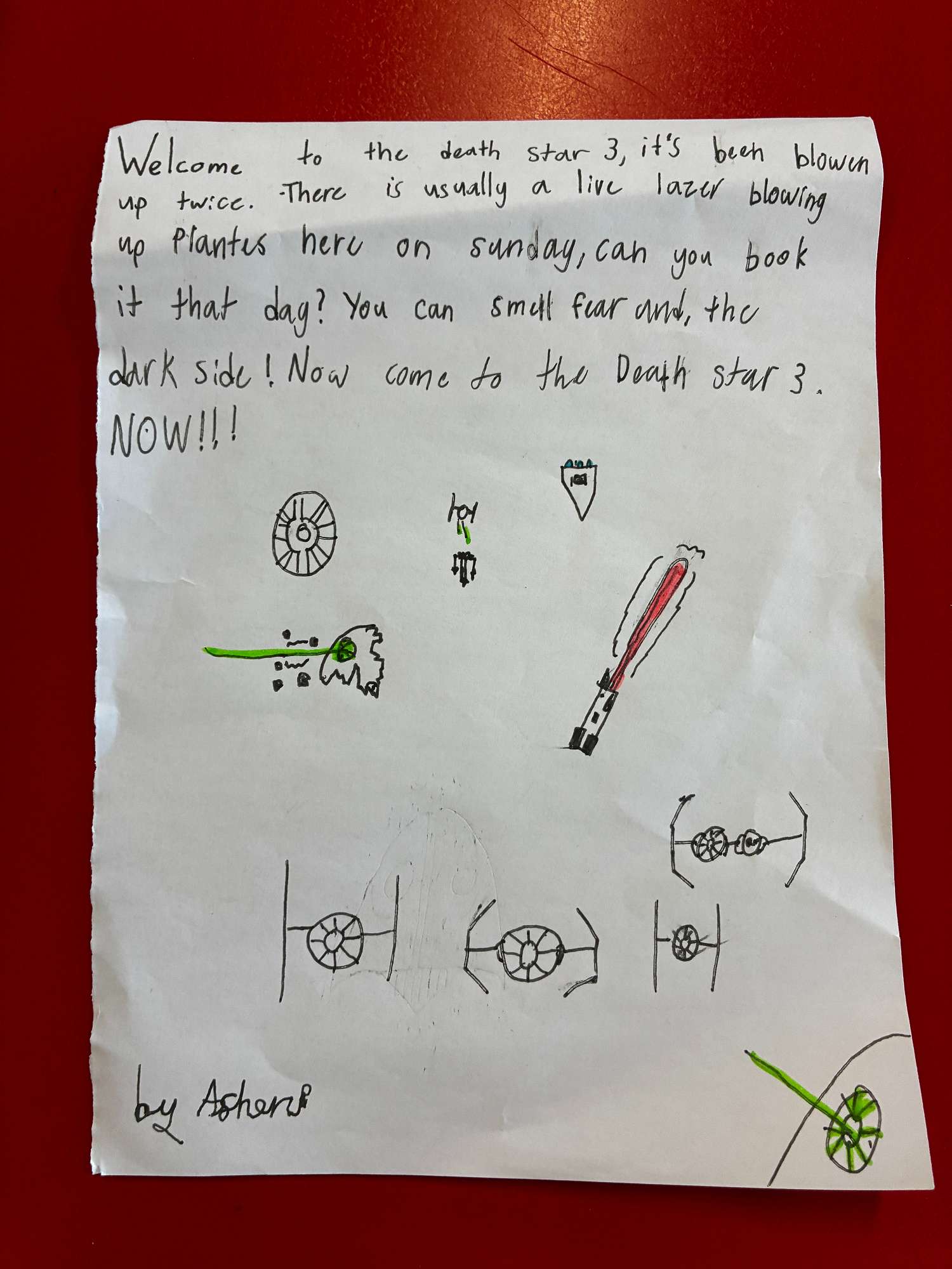 The Hubs have been working on narratives, and how to write more detail characters and settings.Check out Asher's Death Star Description