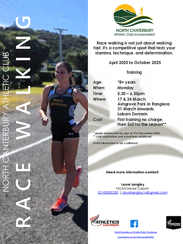 - Race Walking. Our club head coach is our National Womens Track and Road race title holder in Race walking. She is striving to grow the sport in Canterbury and across NZ.
