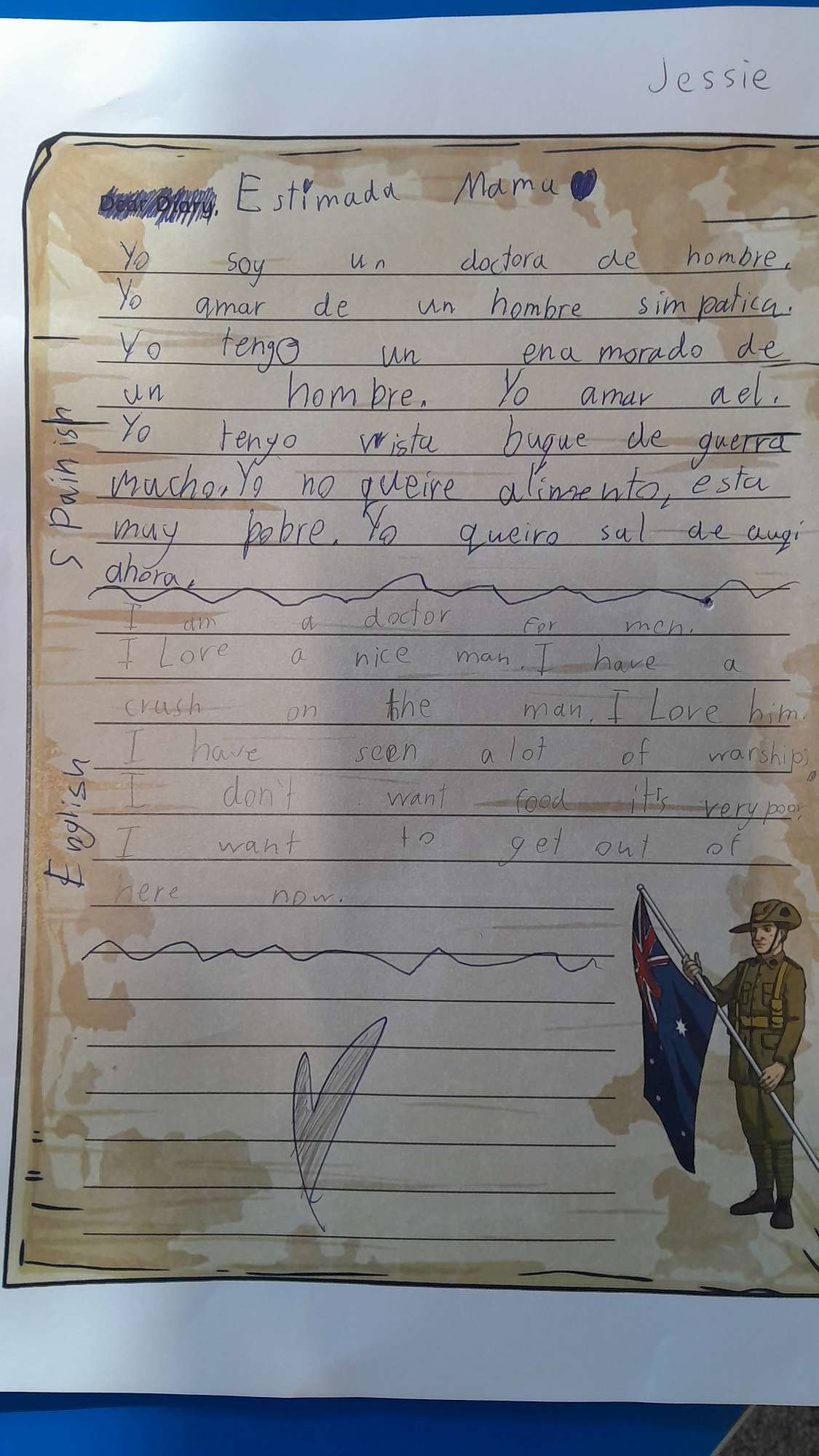 As part of learning around Anzac Day, the classrooms wrote letters from the perspective of soldiers writing home to their families. They managed to capture the conditions of war and the longing to be back in New Zealand. Jessie chose to write her letter in Spanish, which she is learning at home, and then translated it back into English. Amazing job Jessie! | |