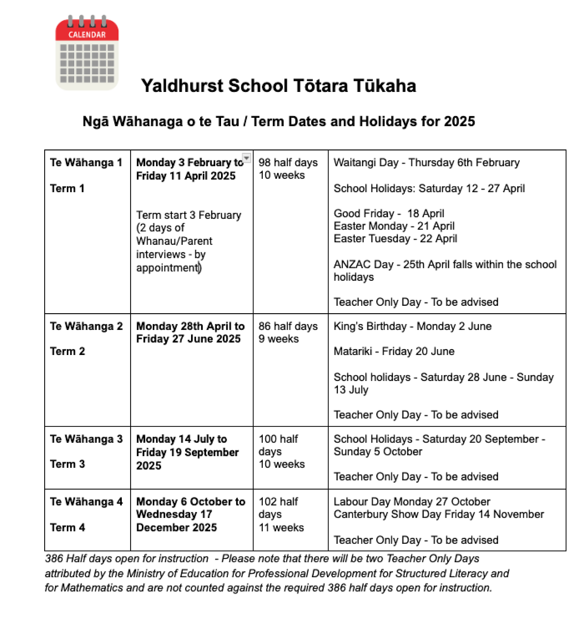 Yaldhurst School Tōtara Tukaha Term Dates and School Holidays 2025 - 2026