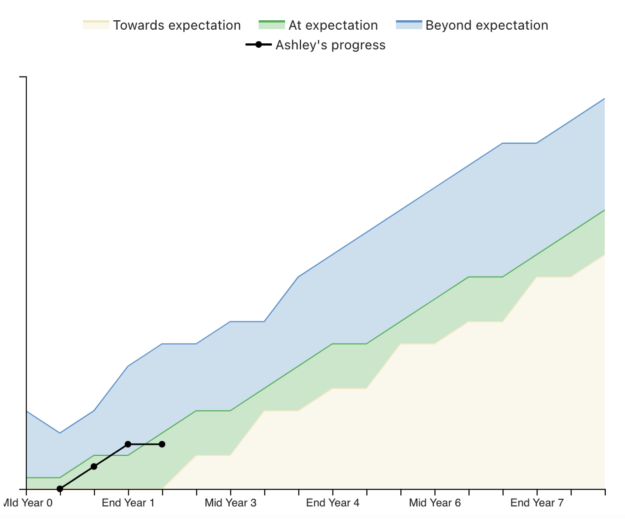 The black line on the graph shows your child's OTJs in the middle and end of each year they have been at school.