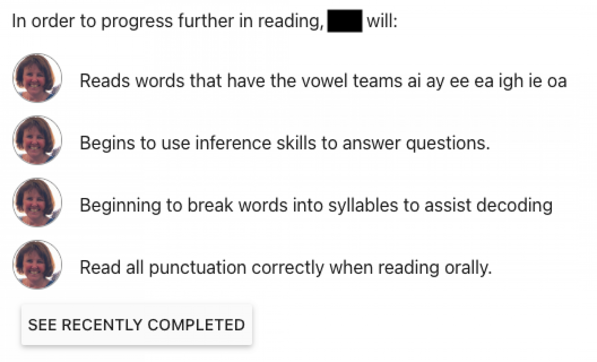 Teachers reset the goals as the learning happens throughout the year. To see what your child has recently achieved, click on See Recently Completed.The photo indicates which teacher assessed and considered the goal achieved.