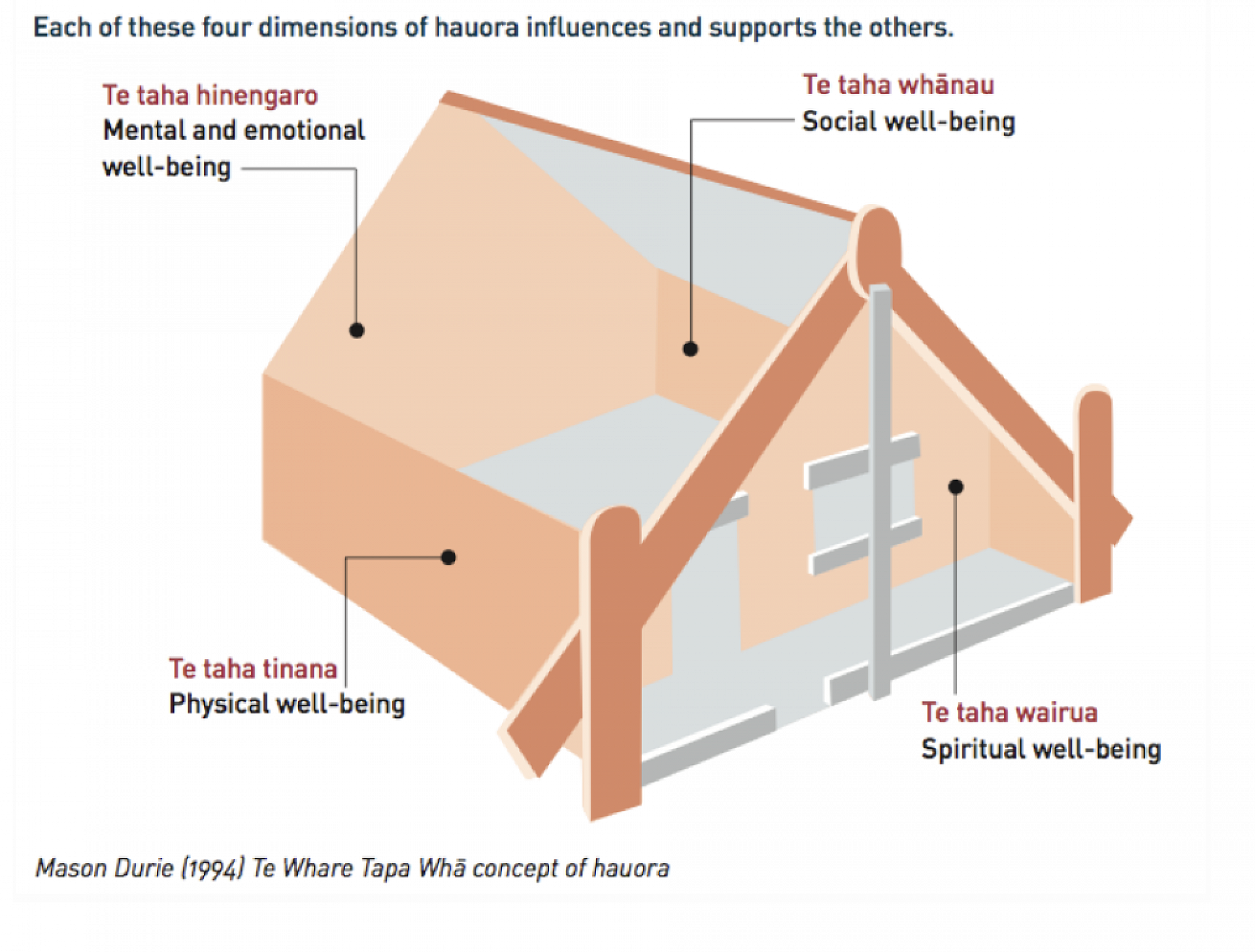 Hauora– a Māori philosophy of well-being that includes the dimensions taha wairua (spiritual health), taha hinengaro (mental health) taha tinana (physical health) and taha whānau (family health). Each one influencing and supporting the others based on Te Whare Tapa Wha.