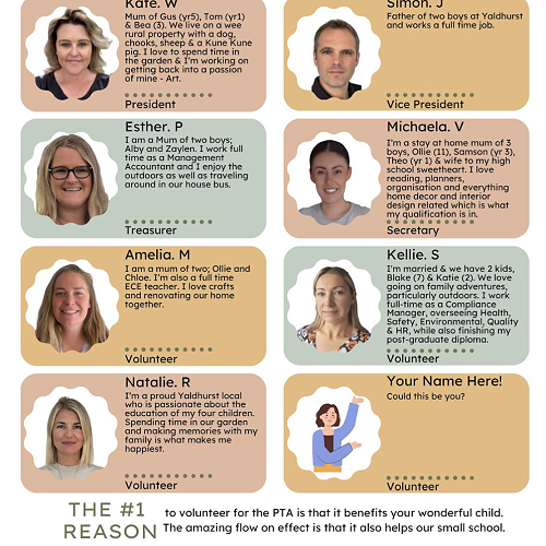 Any parent/caregiver is eligible to be a member of the PTA. We hold monthly meetings and you can join at any of these meetings. Notices for upcoming meetings are put in the School Newsletter. We are always looking for new members to join, the more the merrier. We are also happy to accept help with fundraisers from any parent/caregivers who may not want to join the PTA.